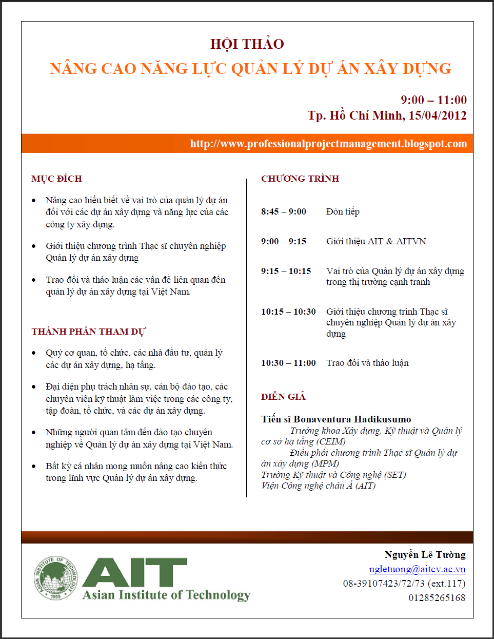 (deadline 30 April 2012) to Ms. Tuong (email ngletuong@aitcv.ac.vn or phone 0913138408) in HCMC; Ms. Ngan, email ngan@aitcv.ac.vn or phone 0912491948) in Ha Noi.